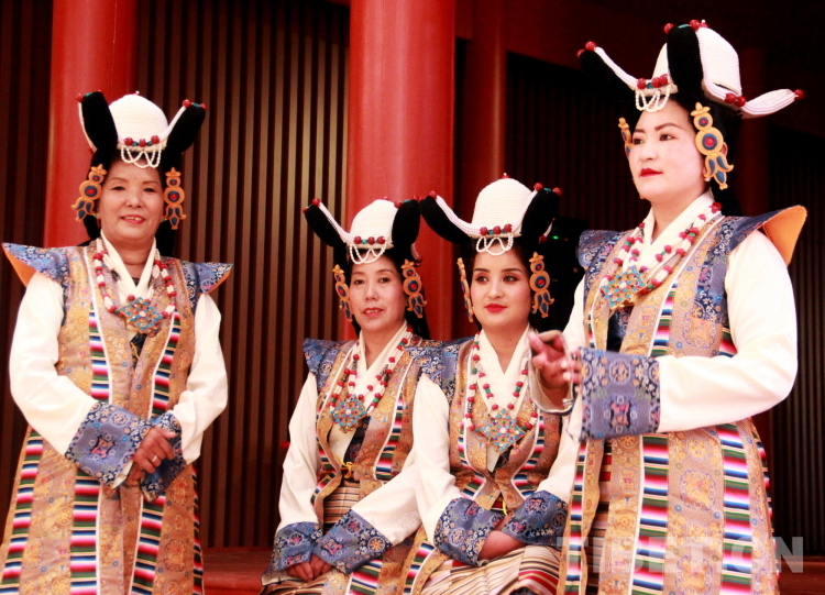 圖為拉薩市城關(guān)區(qū)娘熱民間藝術(shù)團(tuán)演員表演國(guó)家級(jí)非物質(zhì)文化遺產(chǎn)“嘎?tīng)枴睌z影:劉莉