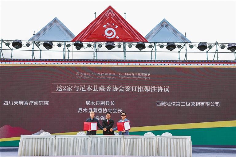 活動當(dāng)天,為讓尼木藏香文化得以更好地傳承下去,尼木縣委副書記、縣長次旺多杰為祖祖輩輩、世世代代用堅守傳承文化的10位非遺傳承人授牌“致敬傳統(tǒng)手工藝人”。在集中簽約儀式上,天府香療研究院、西藏地球第三極營銷有限公司與尼木縣簽訂戰(zhàn)略框架性協(xié)議,深度開發(fā)藏香產(chǎn)業(yè);中國能源建設(shè)集團(tuán)西北電力建設(shè)工程有限公司、國家電投集團(tuán)西藏能源有限公司、北京能源國際控股有限公司、北京龍藝匯鑫科技有限公司四家企業(yè)與尼木縣人民政府簽訂框架協(xié)議,協(xié)議投資合計超150億元。