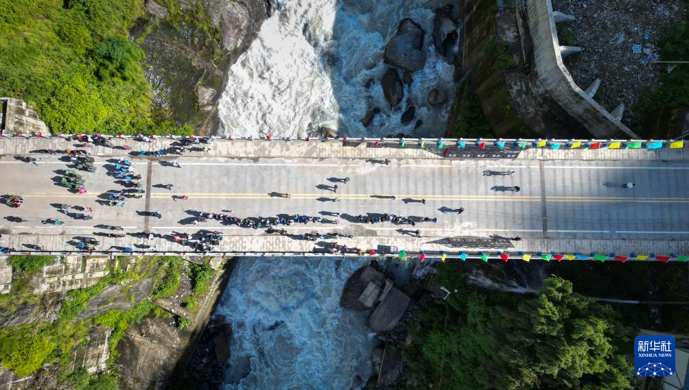 9月1日,往來中尼兩國的人員跨過友誼橋(無人機(jī)照片)。新華社記者 李鍵 攝