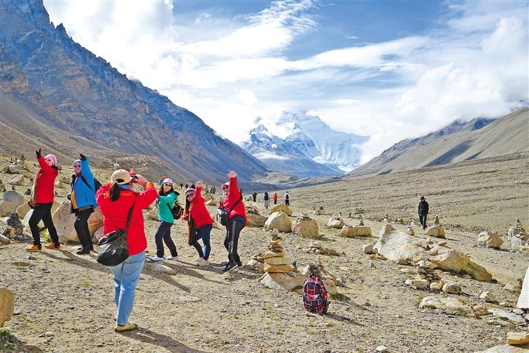 圖為游客在珠峰大本營景區(qū)拍照留念。 記者 益西加措 攝