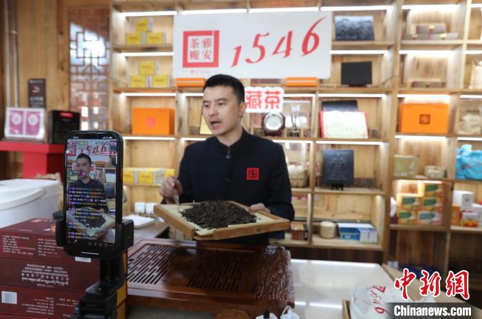 9月14日,四川省雅安茶廠內,工作人員正在直播介紹藏茶。中新網記者 王磊 攝