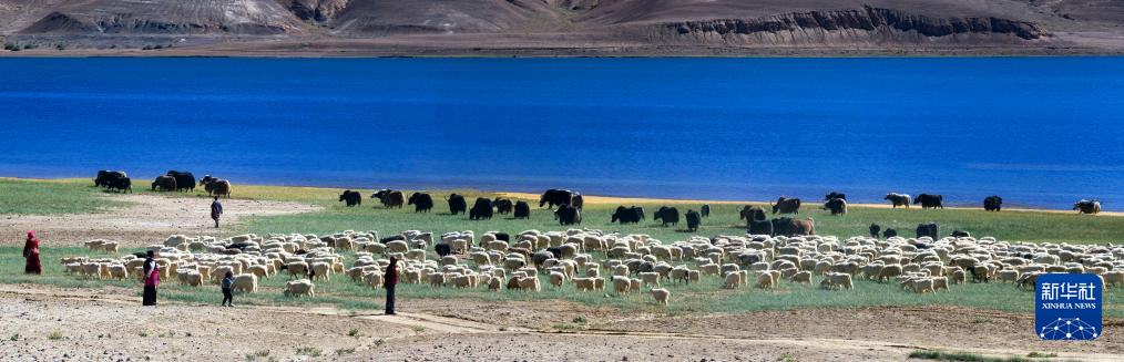 牧民在班公湖畔放牧(無人機照片,9月21日攝)。新華社記者 姜帆 攝