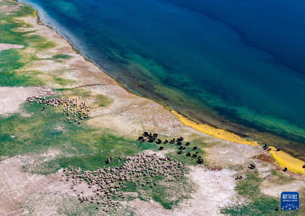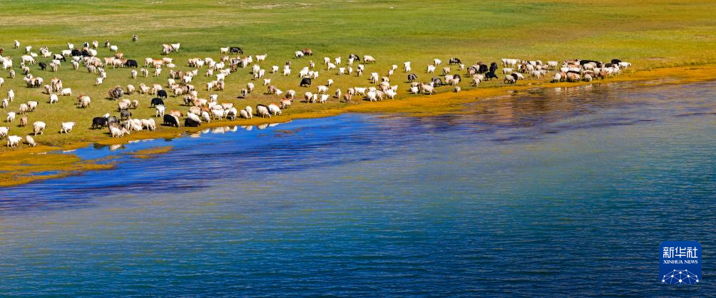 羊群在班公湖畔飲水(無人機照片,9月21日攝)。新華社記者 姜帆 攝
