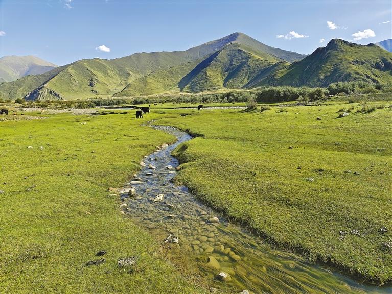 位于布崗村的渠嚓埠濕地,因其眾多島嶼分割水系形成淺灘,讓河水經(jīng)過時變得平緩,在陽光照射下水溫升高,綠樹成蔭、草地肥美,是戶外水上運動的絕佳場所,游客在享受淺灘漂流的舒適中感受大自然的魅力。草地像是一幅巨大的毯子又寬又平,牦牛在草地上悠閑覓食,黑色點點,將草地點綴得十分美麗。