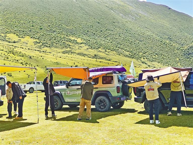 覺丹峰的對面是一大片平整的壩子,在志愿者的引導下,車友們將車輛有序停放好,迫不及待地開始搭設(shè)帳篷、側(cè)邊天幕等露營裝備。