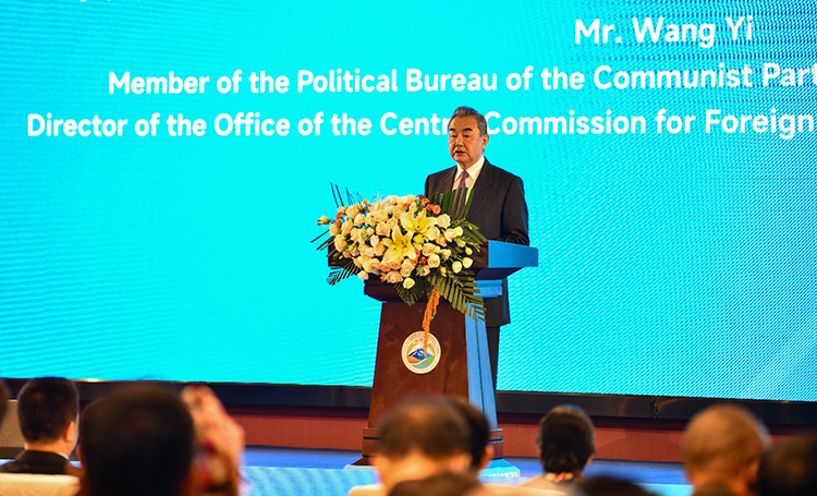 圖為開幕式暨主旨論壇現(xiàn)場中共中央政治局委員、中央外事工作委員會辦公室主任、外交部部長王毅在致辭 攝影:新華社記者晉美多吉