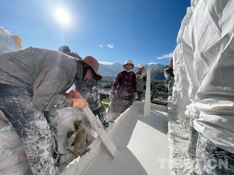 從10月18開始,很多信教群眾和工作人員穿著大褂,或背著裝了白色液體的大桶小桶、或抱著裝了白糖蜂蜜等大袋小袋,紛紛走向布宮的每個角落,加入到粉刷布達(dá)拉宮外墻的工作中。