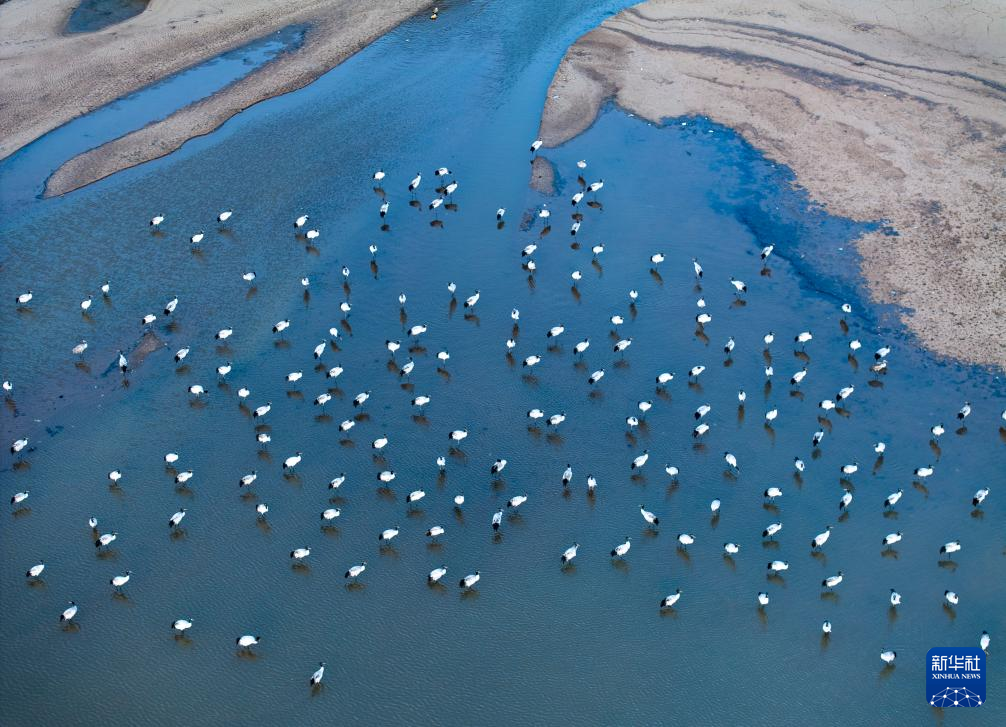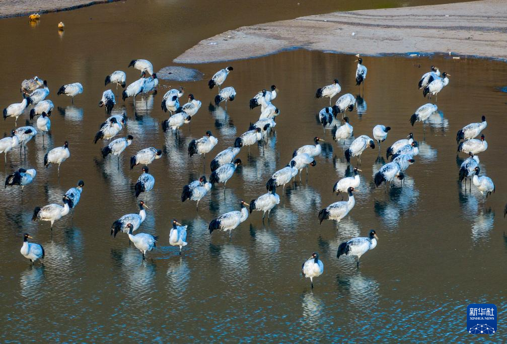 這是在拉薩市林周縣虎頭山水庫拍攝的越冬黑頸鶴(10月24日攝,無人機照片)。新華社記者 姜帆 攝 ??