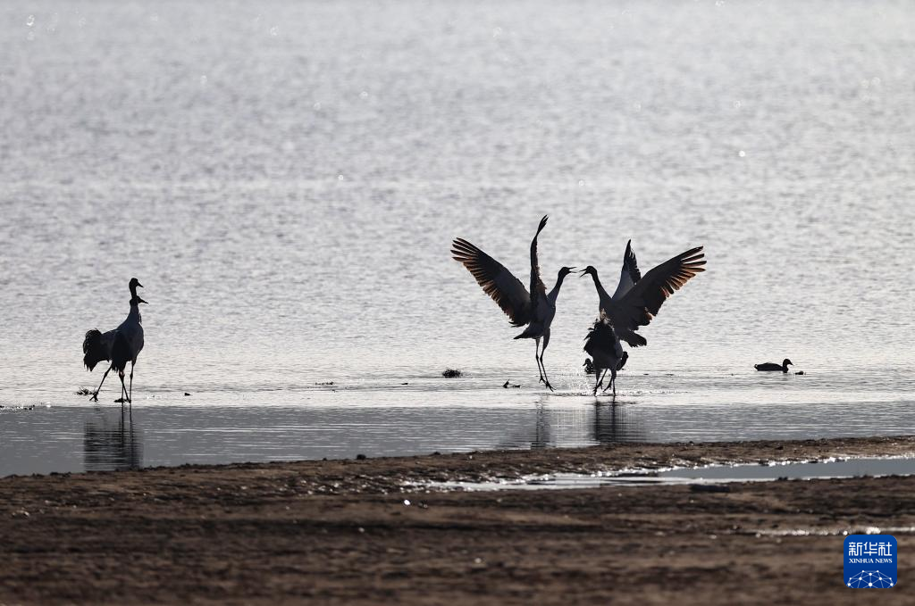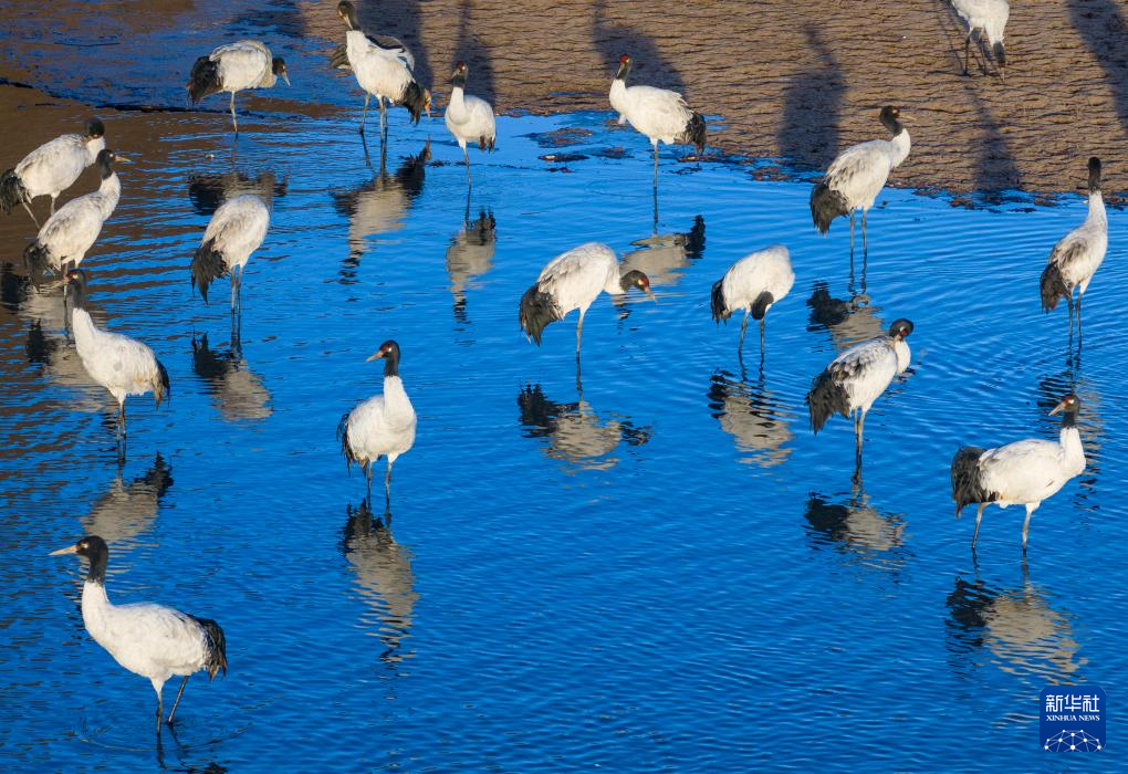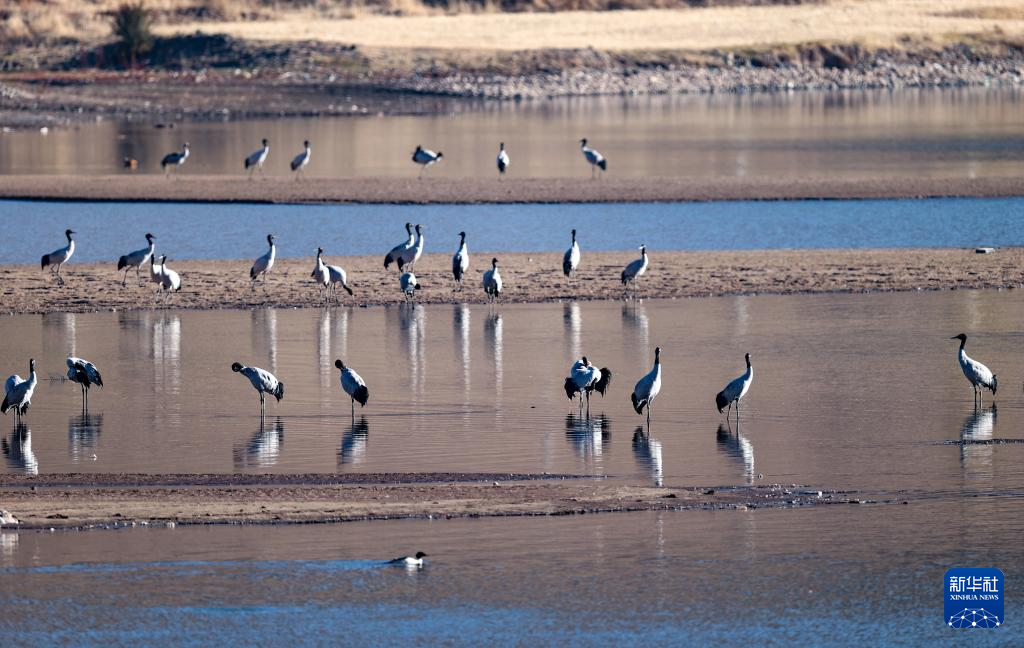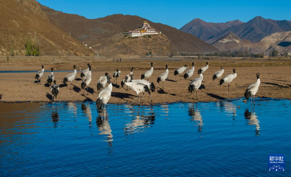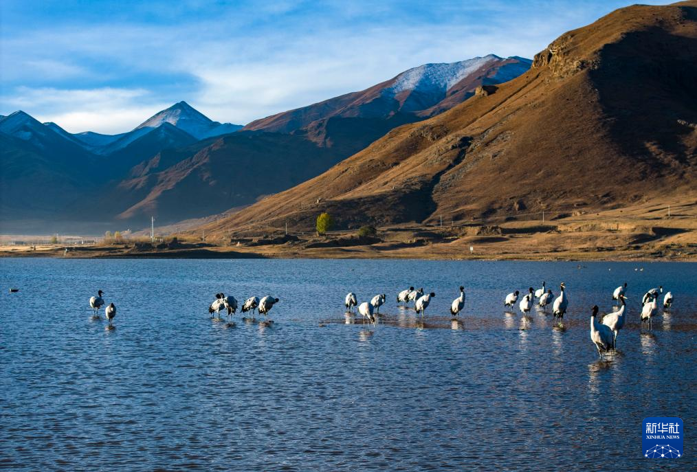 這是在拉薩市林周縣虎頭山水庫拍攝的越冬黑頸鶴(10月24日攝)。新華社記者 姜帆 攝 ??