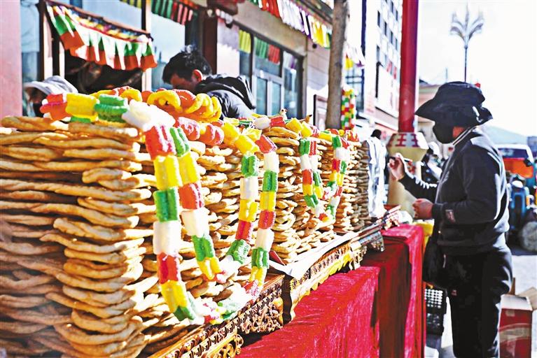 定好了藏裝的布料和款式,索朗玉珍便和母親步行來(lái)到了八廓商城,奔向卡賽、風(fēng)干牦牛肉、奶渣、糖果等年貨銷售區(qū)。