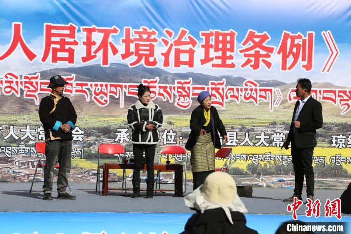 圖為瓊結(jié)縣藝術團正在表演關于人居環(huán)境治理方面的小品。次旦卓嘎 攝