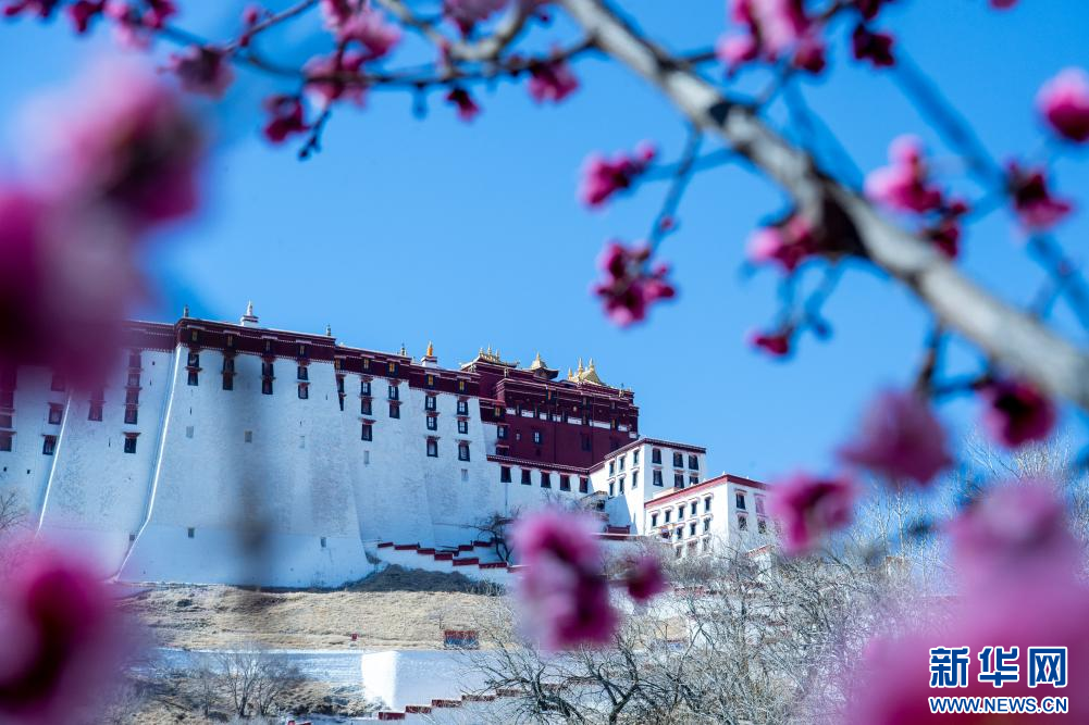 3月15日,杏花映襯下的布達拉宮。新華網 旦增努布 攝