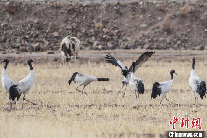 圖為黑頸鶴在林周縣境內(nèi)的農(nóng)田里覓食、嬉戲。貢嘎來松 攝