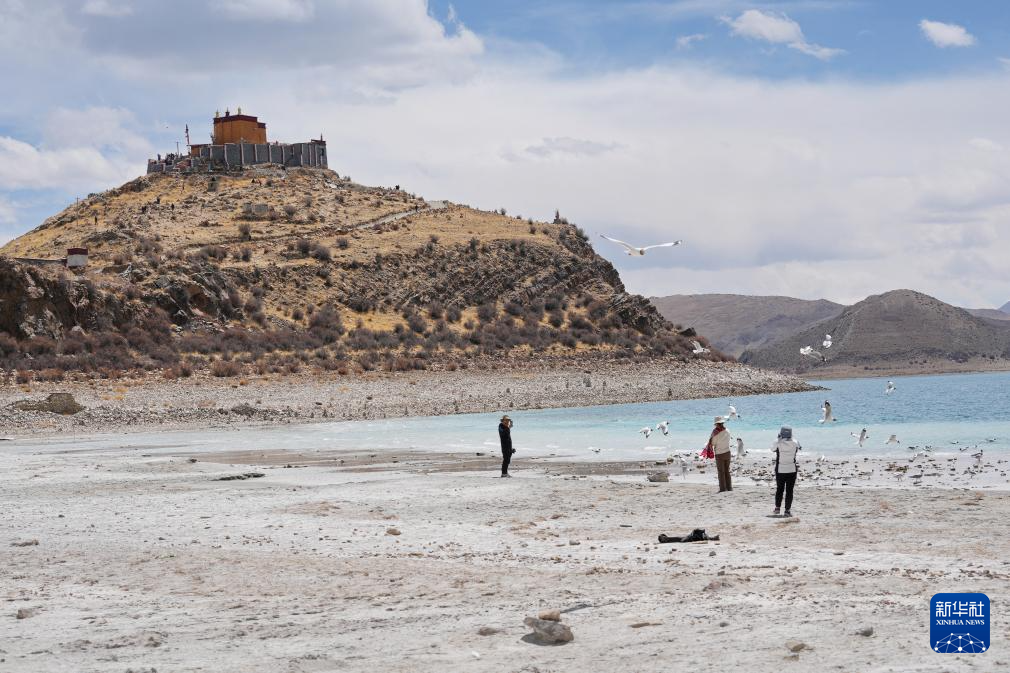 游客在羊卓雍錯(cuò)北岸的日托寺附近投喂棕頭鷗(4月5日攝)。新華社記者 張汝鋒 攝