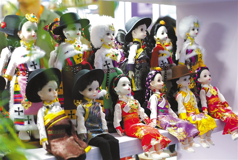 在國貨特色潮品展區(qū)西藏展臺(tái)拍攝的人偶。新華社記者 田薇薇 攝