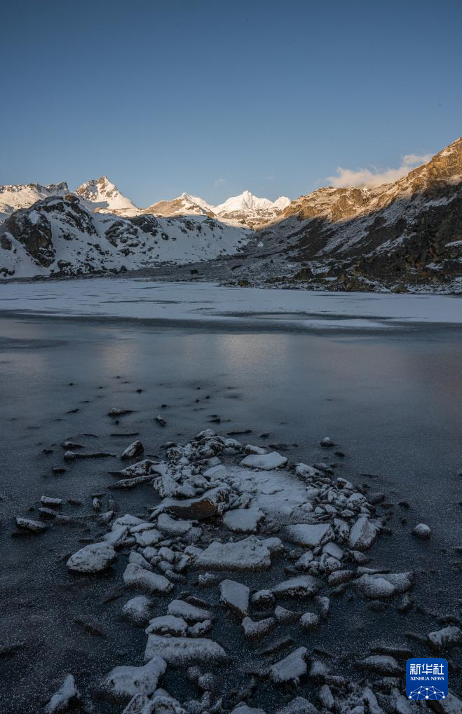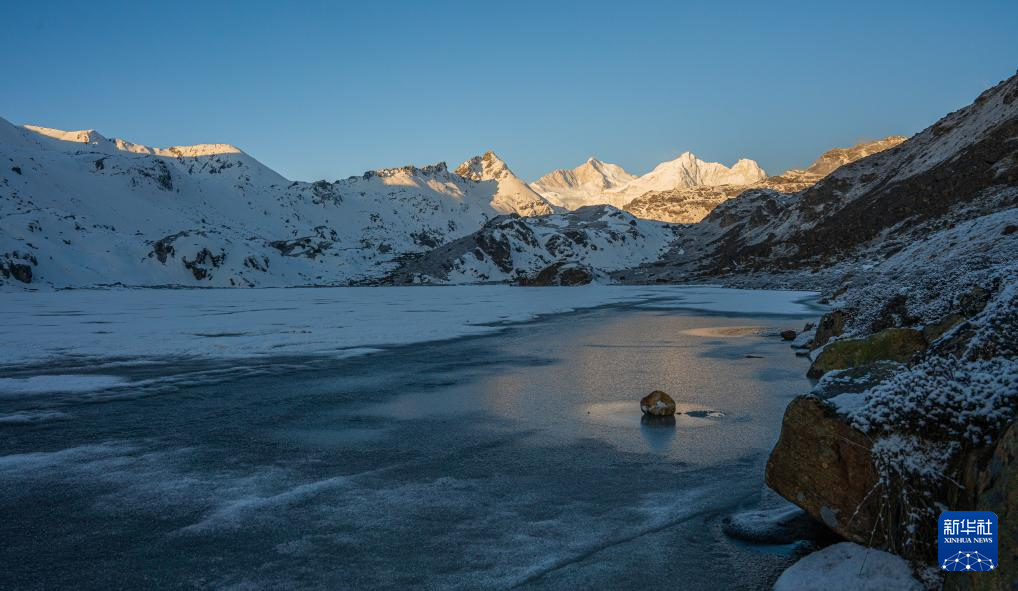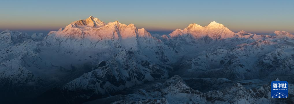 4月17日,晨光照耀嘎瑪溝及遠(yuǎn)處的喜馬拉雅山脈,清晨的第一縷陽(yáng)光與雪山相映成趣,形成“日照金山”景象。