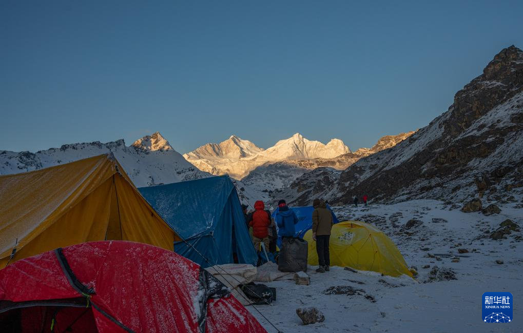 游客在嘎瑪溝中的曉烏措營(yíng)地觀賞“日照金山”景象(4月17日攝)。新華社記者 楊帆 攝