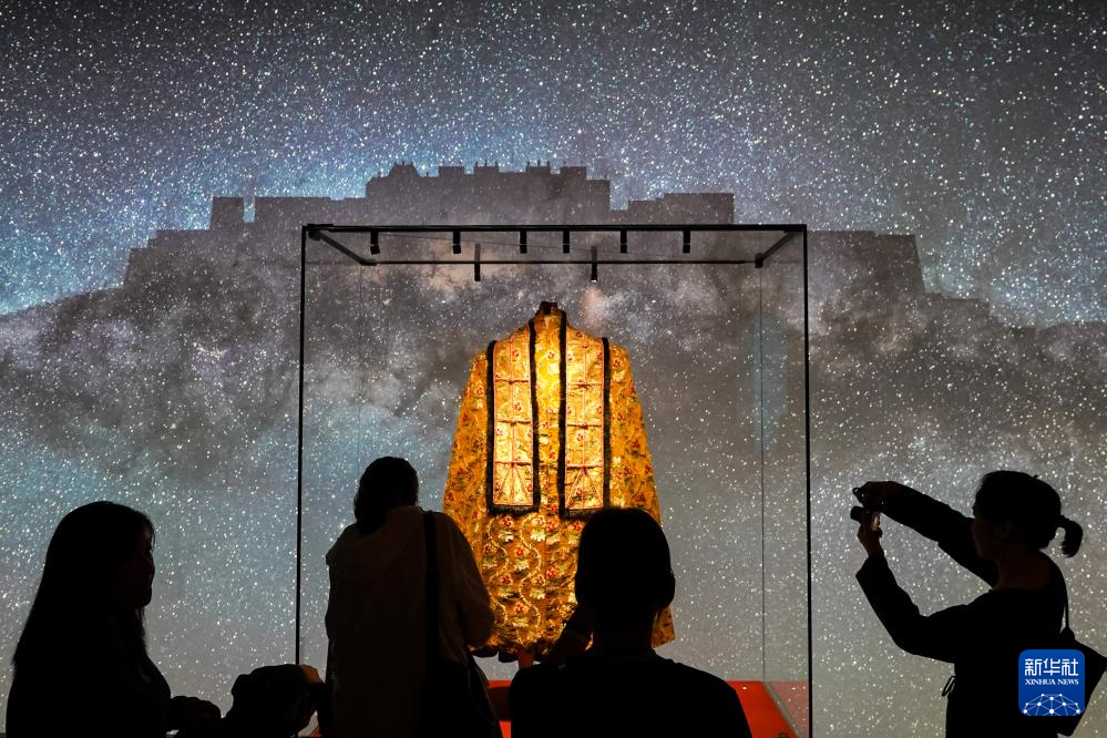5月11日,觀眾在展出現(xiàn)場參觀拍攝“金寶地花卉紋斗篷”。新華社記者 李博 攝