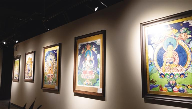 西藏大學藝術(shù)系研究生格桑感嘆:“看到羅布老師的作品,真的能感受到傳承人的不容易,一幅較大的唐卡需要半年乃至一年的時間才能完成,花費的時間、精力和心血是無可比擬的?!?/p>