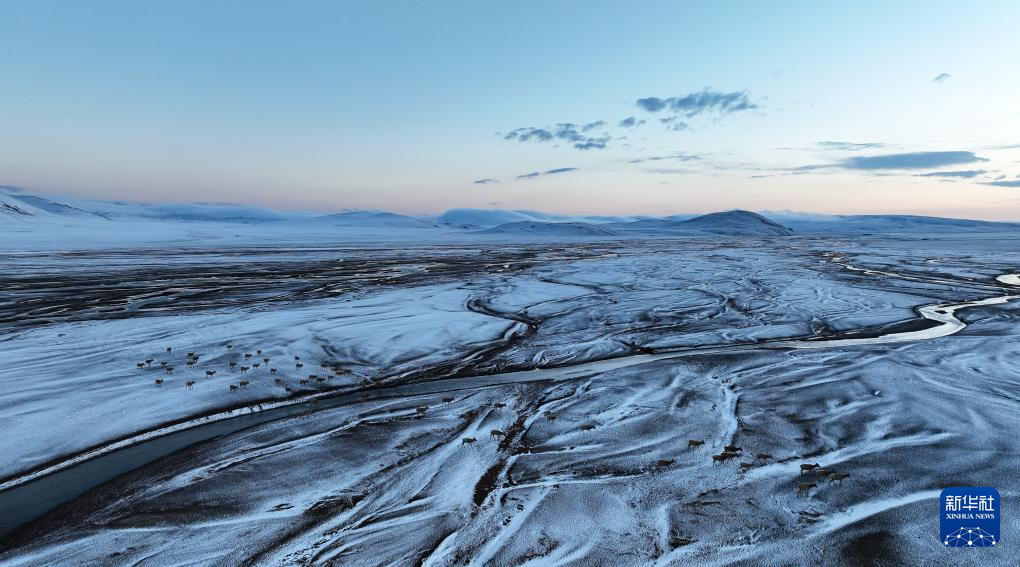 這是在甜水河畔荒灘雪地中向產(chǎn)羔地遷徙的藏羚羊(6月15日攝,無人機照片)。新華社記者 晉美多吉 攝