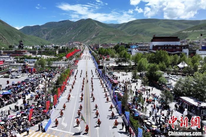 當(dāng)日,來自玉樹州一市五縣的數(shù)千名康巴藏族兒女身著盛裝,載歌載舞,以行走巡演方式展示玉樹豐富多彩的非物質(zhì)文化遺產(chǎn)。近兩小時的巡游,吸引了眾多省內(nèi)外游客和當(dāng)?shù)馗髯迦罕妸A道觀賞。