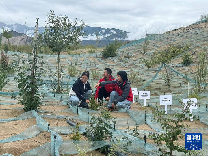 中國科學(xué)院成都山地災(zāi)害與環(huán)境研究所研究員周萍帶領(lǐng)研究生在西藏扎囊縣沙化土地生態(tài)治理綜合示范區(qū)開展沙地試驗樣方植被生長狀況監(jiān)測。新華社記者 顧天成 攝