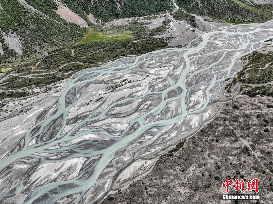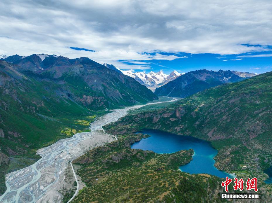 圖為三色湖旁邊的冰雪融化的河流。(無人機(jī)照片)中新社記者 貢嘎來松 攝