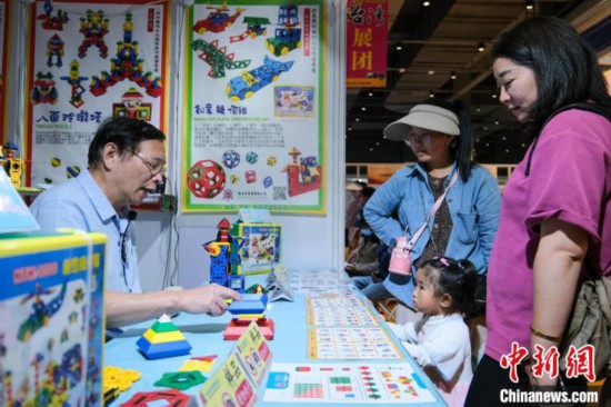 8月7日,臺(tái)灣博士兒實(shí)業(yè)有限公司總經(jīng)理葉國義(左)在展覽現(xiàn)場(chǎng)演示益智教具。中新社記者 江飛波 攝