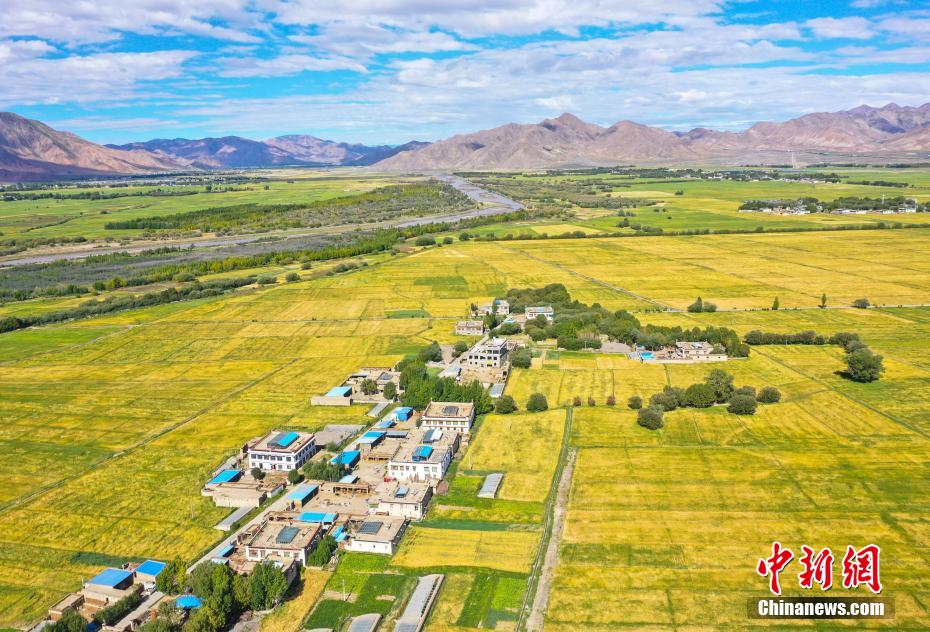 8月25日,西藏日喀則白朗縣仁青崗村,田園、村莊、河流、公路、遠(yuǎn)山交相輝映,構(gòu)成一幅美麗的田園風(fēng)光畫(huà)卷。(無(wú)人機(jī)照片)