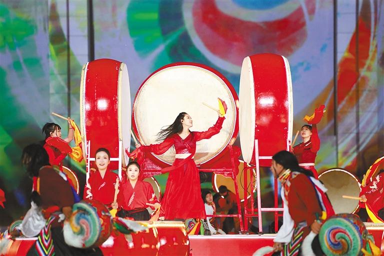 共振共鳴中國鼓,交流交融民族情。在激昂的鼓聲和大開大合的舞姿中,開幕式序曲《大江之鼓》緩緩呈現(xiàn)在所有人面前。喆友打擊樂團(tuán)、山南市瓊結(jié)久河卓舞隊(duì)等隊(duì)伍的近70名鼓手同臺(tái)獻(xiàn)藝、默契配合,讓鼓聲共振、情感共鳴,展現(xiàn)了激情洋溢、魅力無限的中華鼓文化。