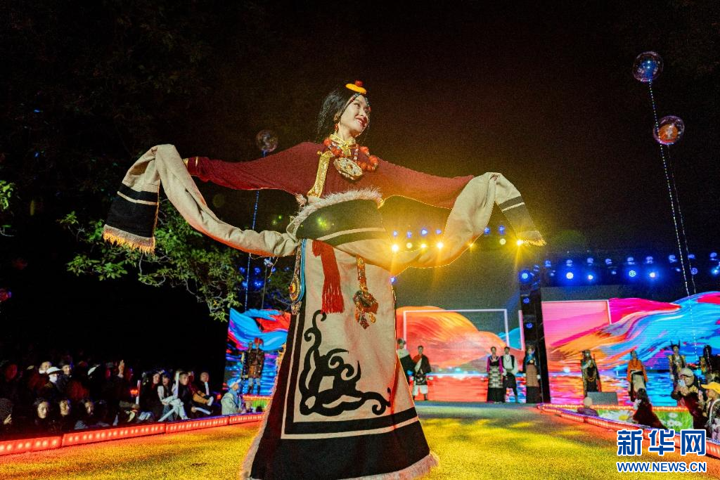 24日,西藏山南市加查縣舉辦“魅力達(dá)布·印象綻放”民族服飾秀活動(dòng)。色彩斑斕的民族服飾在現(xiàn)場雨珠與燈光的點(diǎn)綴下,更顯生動(dòng)與靚麗。