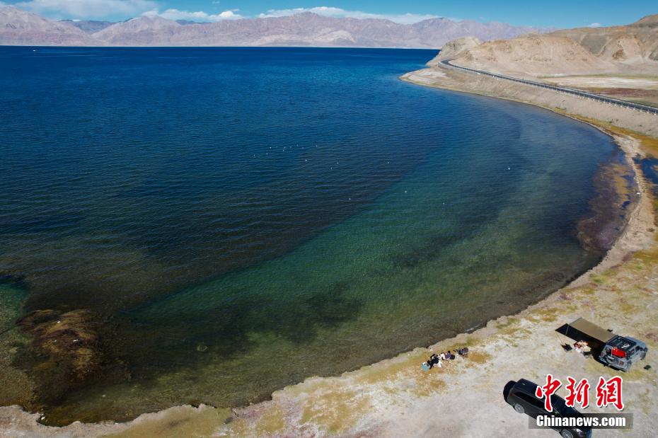 10月4日,游客在班公湖邊休閑露營(yíng)?!笆弧眹?guó)慶假期,不少游客來到西藏日土縣班公湖游玩。(無人機(jī)照片)中新社記者 崔楠 攝