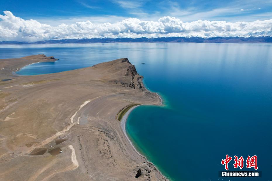 國慶期間,中新網(wǎng)記者自駕西藏藏北羌塘草原,途經(jīng)“天湖”納木錯,高原鹽湖班戈湖以及西藏第一大湖色林錯等地。秋天高原藍(lán)天白云的映襯下,藏北湖泊猶如一面面巨大的“寶石藍(lán)”鏡子鑲嵌于高原大地,景色壯麗。圖為10月2日,航拍西藏第一大湖色林錯北岸風(fēng)光。記者 江飛波 攝