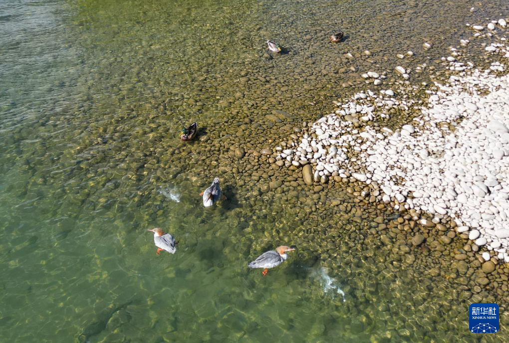 在林芝雅尼國家濕地公園內(nèi),不同種類的野生鳥類棲息在尼洋河畔(10月24日攝,無人機照片)。新華社記者 劉天宇 攝??