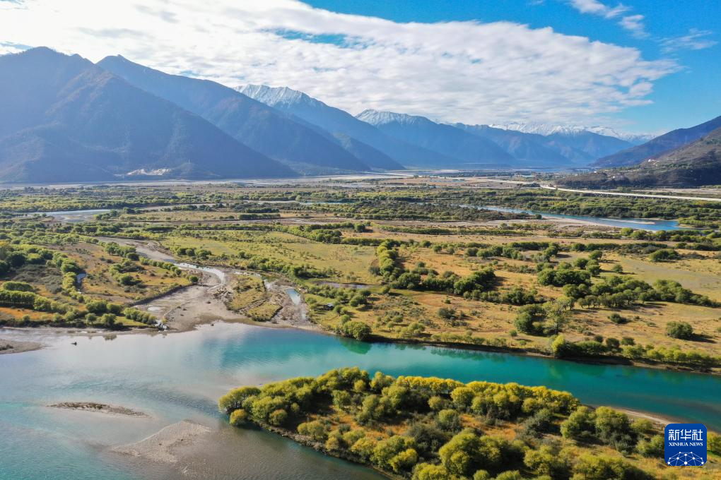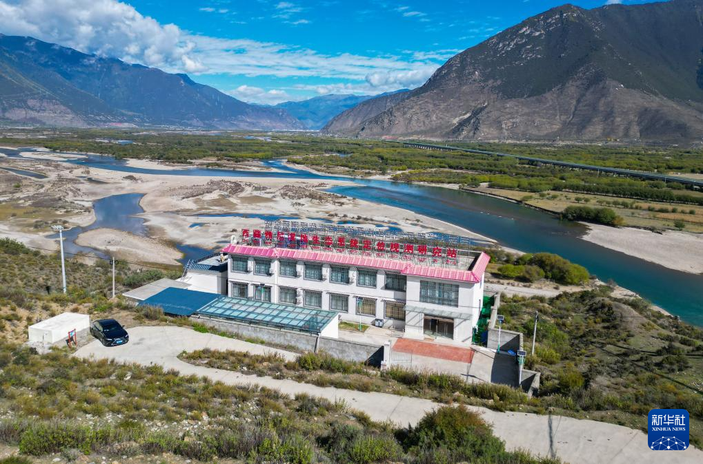 這是在林芝雅尼國家濕地公園尼洋河畔拍攝的生態(tài)監(jiān)測系統(tǒng)(10月24日攝,無人機照片)。新華社記者 劉天宇 攝??