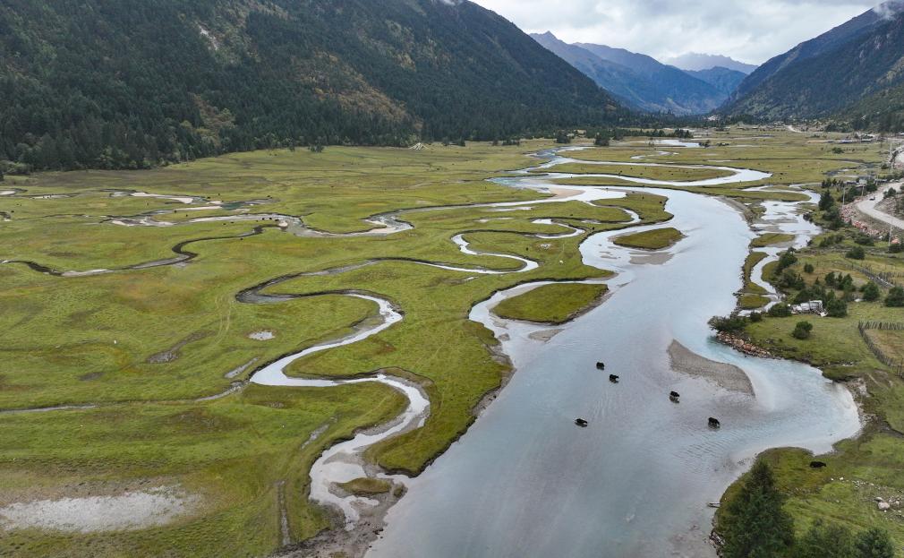 10月4日,在林芝工布江達(dá)縣,一隊牦牛涉水通過河流(無人機(jī)照片)。新華社記者 晉美多吉 攝 ??