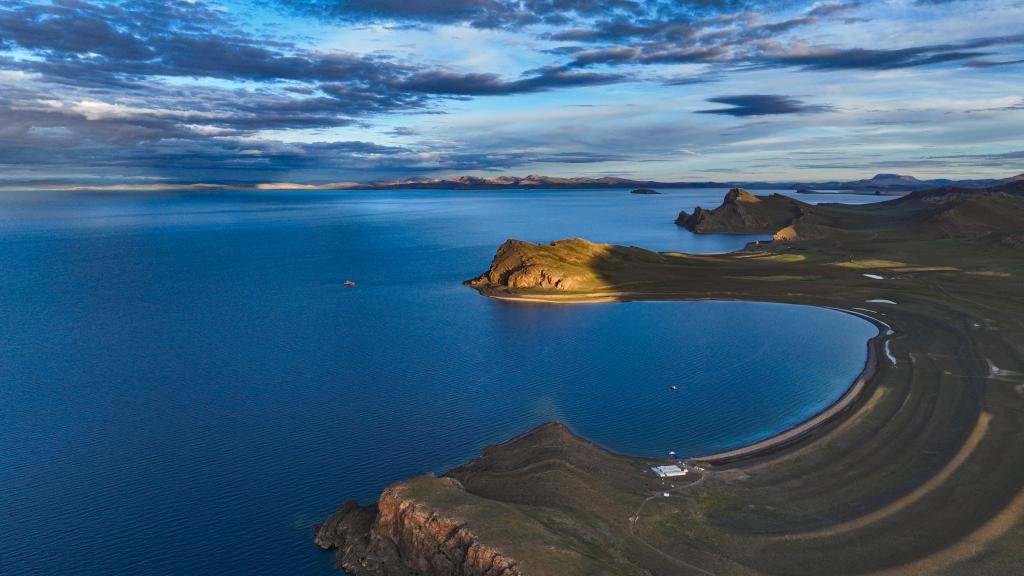 7月11日傍晚的納木錯湖畔(無人機(jī)照片)。新華社記者 晉美多吉 攝 ??
