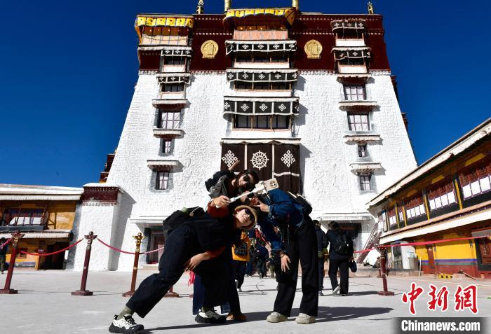 隨著2024冬游西藏的啟動(dòng),西藏所有A級(jí)景區(qū)(寺廟景區(qū)除外)免費(fèi)游覽,布達(dá)拉宮也成為冬游西藏?zé)衢T游覽地之一。圖為11月1日,來(lái)自四川的信眾在布達(dá)拉宮拍照留念。中新社記者 李林 攝