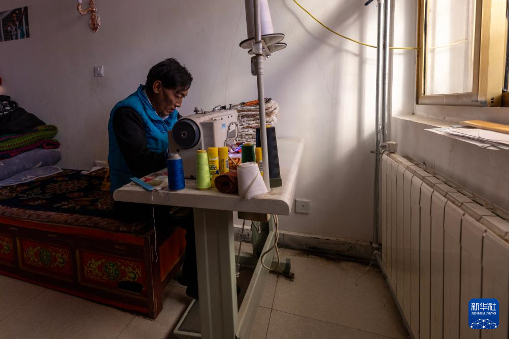 措勤縣扎日南木錯社區(qū)居民林瓊在自家的暖氣房內(nèi)制作傳統(tǒng)民族帽飾(11月20日攝)。新華社記者 姜帆 攝 ??