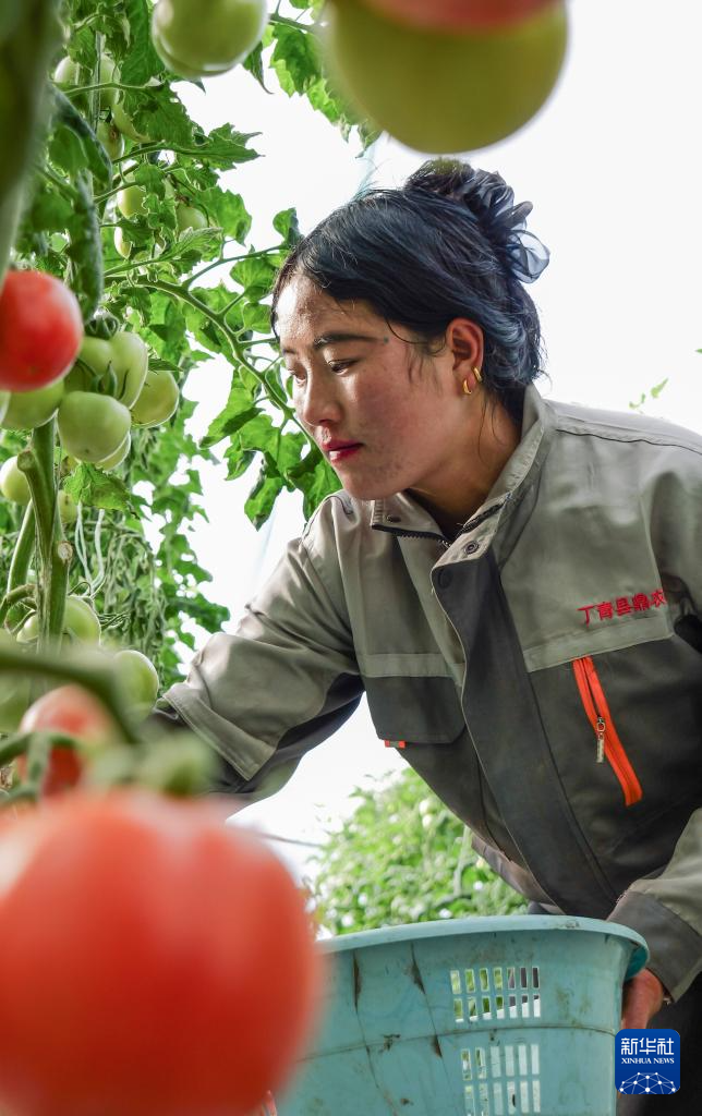11月22日,在丁青縣農(nóng)業(yè)生態(tài)產(chǎn)業(yè)園,工作人員在采摘西紅柿。新華社記者 楊帆 攝?
