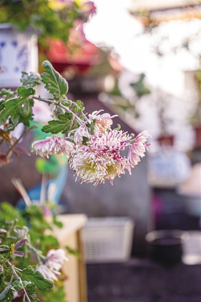 走進(jìn)八廓街、穿過繁華的大昭寺廣場,沿著古巷小路便能來到貢桑孜大院。邁入大院,首先映入眼簾的是獨(dú)具韻味的傳統(tǒng)藏式建筑風(fēng)格,白墻、紅頂、黑窗沿,陽光滲過在微風(fēng)中飄動(dòng)的“香布”,稀稀散散地落在精美的木雕窗花上,襯得陽臺(tái)木制立柱上的花紋分外醒目。各式花卉與居民生活用品一同擺放在四四方方的院落中,卻并不顯得擁擠,反而增添了一絲浪漫的煙火氣。