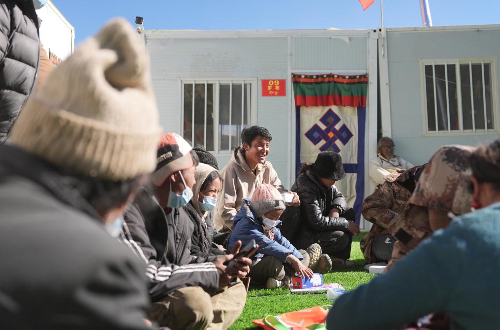 古榮村村委會(huì)主任桑杰(中)在安置點(diǎn)和群眾閑聊。新華社記者 晉美多吉 攝