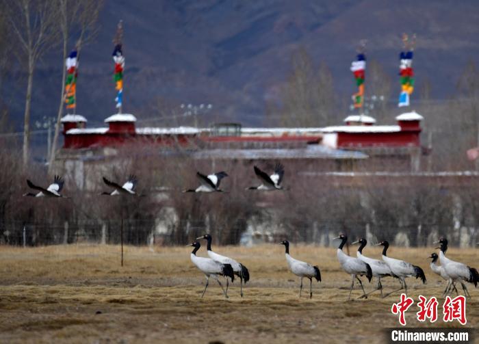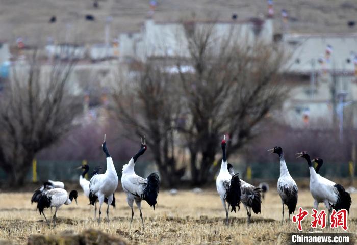 黑頸鶴是全球十五種鶴類中唯一在高原地區(qū)繁殖和越冬的鶴類,被譽為“高原神鳥”,屬中國國家一級保護動物。每年10月中下旬左右,黑頸鶴陸續(xù)飛抵雅魯藏布江中游河谷等地越冬。圖為3月8日,西藏拉薩林周縣黑頸鶴保護區(qū),黑頸鶴在田間覓食。中新社記者 李林 攝