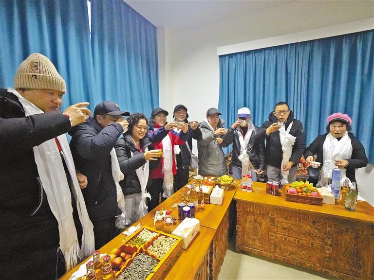 “古突”之夜,“走進雪域邊陲 體驗藏歷新年”旅游團游客在玉麥以酥油茶代酒,祝賀藏歷新年,祝福祖國繁榮昌盛?! ?/p>
