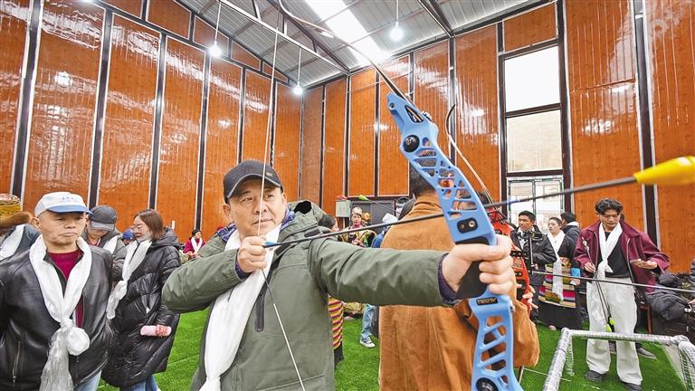 游客在扎日鎮(zhèn)體驗當?shù)貍鹘y(tǒng)體育項目——響箭?! ?/p>