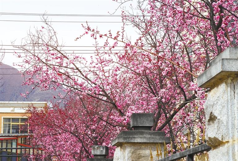 圖為拉薩市軍民路上,粉色的花朵在春日暖陽中絢麗綻放。 記者 鄭常容 攝