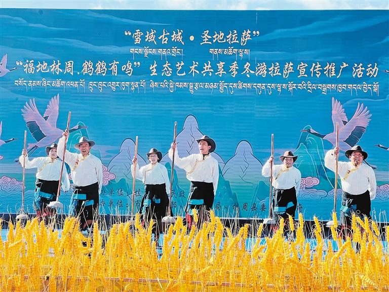 當(dāng)溫暖的陽光輕柔地灑在拉薩河谷,黑頸鶴清脆的鳴叫聲喚醒了林周濕地寧靜的清晨?!案5亓种堋Q鶴有鳴”生態(tài)藝術(shù)共享季之“冬游拉薩”宣傳推廣活動,以歌舞表演、生態(tài)主旨演講、黑頸鶴攝影作品展、鶴文化專家座談等,融合了生態(tài)、藝術(shù)與文化的盛宴,讓人在雪山、湖泊與鶴影交織的詩意中,感受“冬游拉薩”的獨特魅力。