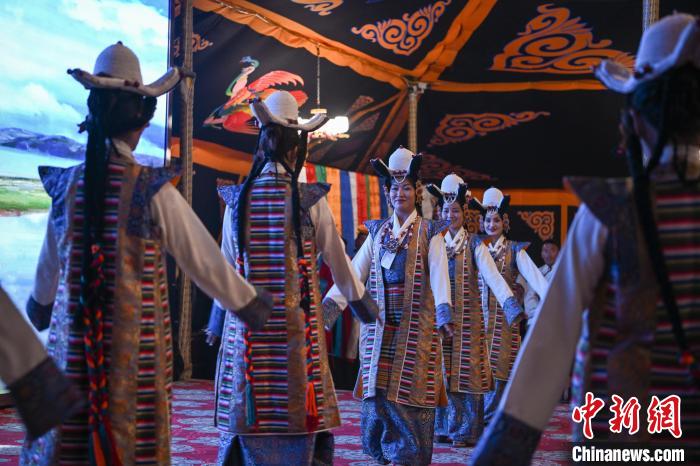 5月18日,西藏拉薩首屆“雪域古城·圣地拉薩”文化旅游節(jié)“情定當(dāng)雄”篝火鍋莊晚會(huì)在當(dāng)雄縣賽馬場(chǎng)熱鬧舉行?;顒?dòng)開(kāi)場(chǎng),當(dāng)雄縣盛大的迎賓儀式,盡顯藏族人民的熱情好客。隨后,拉薩各縣區(qū)帶來(lái)極具地方特色的文藝節(jié)目,舞蹈、歌曲等表演精彩紛呈,展現(xiàn)了拉薩多元文化魅力。傍晚,游客市民在賽馬場(chǎng)黑帳篷中觀看非遺展示,深入了解藏文化精髓。夜幕降臨,眾人圍在篝火旁跳起鍋莊,歡聲笑語(yǔ)回蕩在高原夜空。圖為當(dāng)雄牧民手持哈達(dá)參加迎賓儀式。中新社記者 貢嘎來(lái)松 攝