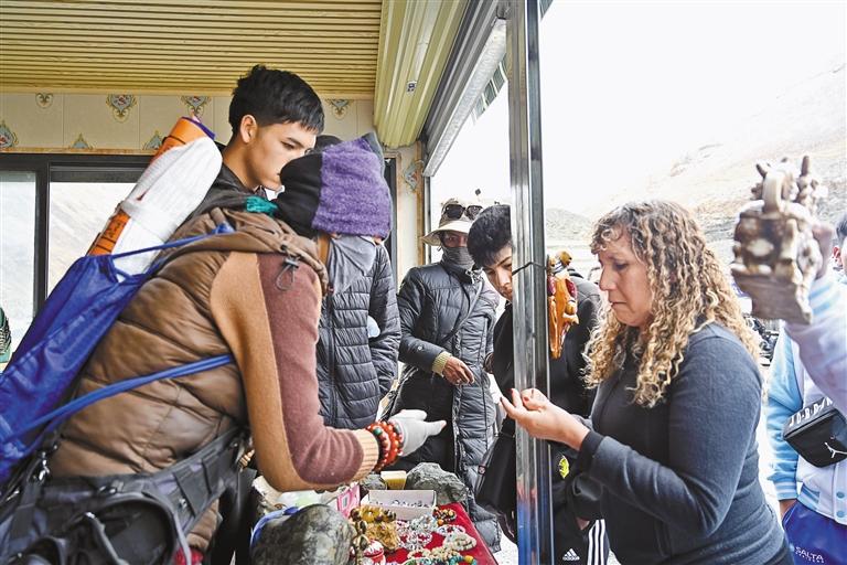 新奇感過后,游客們開啟購物模式?!鞍⒓眩@個掛飾可以定制嗎?”“你們可以發(fā)快遞嗎?”對于一連串的問題,阿佳格桑忙碌地一一回答著,“你們想要什么圖形,我們就給你定制什么圖形?!薄拔覀冞@兒快遞很快,今天下單明天就給你發(fā)!”短短半個小時,“阿佳格桑工坊”的生意火爆,銷售藏式靠墊、藏式地毯、掛飾等特色產(chǎn)品4000多元?!盎厝ズ螅乙ㄟ^自媒體平臺,宣傳這次西藏之旅的所見所聞,讓更多親朋好友來西藏旅游!”日本游客琴音有感而發(fā)。