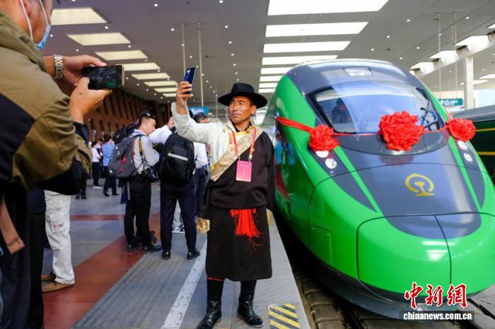 資料圖為2021年6月25日,西藏拉林鐵路開通運(yùn)營(yíng),民眾在拉薩火車站與復(fù)興號(hào)拍照留念。當(dāng)日,斯朗旺扎系首發(fā)司機(jī)。中新網(wǎng)記者 江飛波 攝